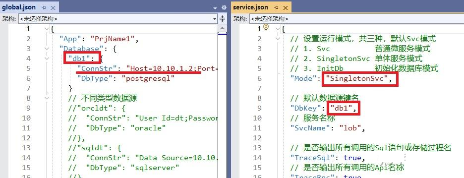 VS打开解决方案PrjName1-svc.sln,修改etc/config/目录下的 global.json 和 service.json 文件,主要修改数据库连接串