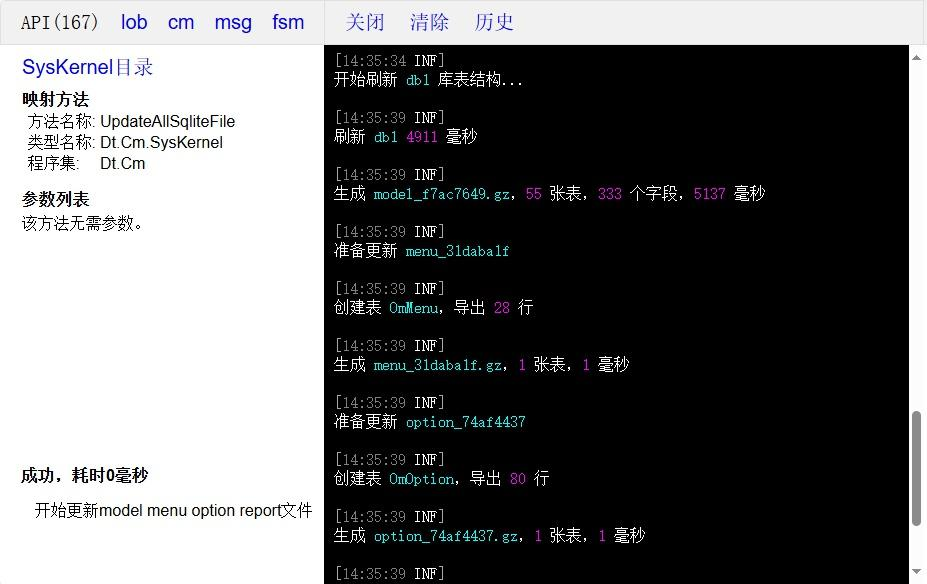 API 点击测试方法,将生成所有sqlite文件,日志输出:UpdateAllSqliteFile 生成所有sqlite文件 始终保持服务运行状态,以便客户端App运行时连接 或 VS开发使用搬运工扩展添加框架代码时连接
