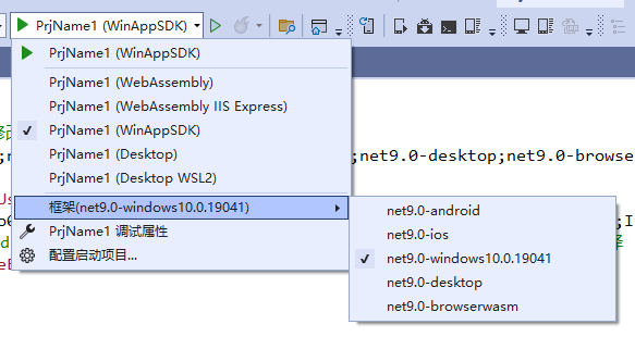 项目设为启动项目,选择启动框架PrjName1 (WinAppSDK)