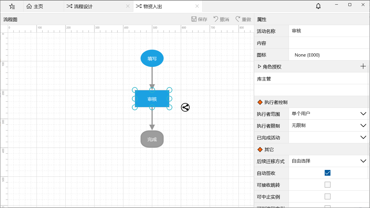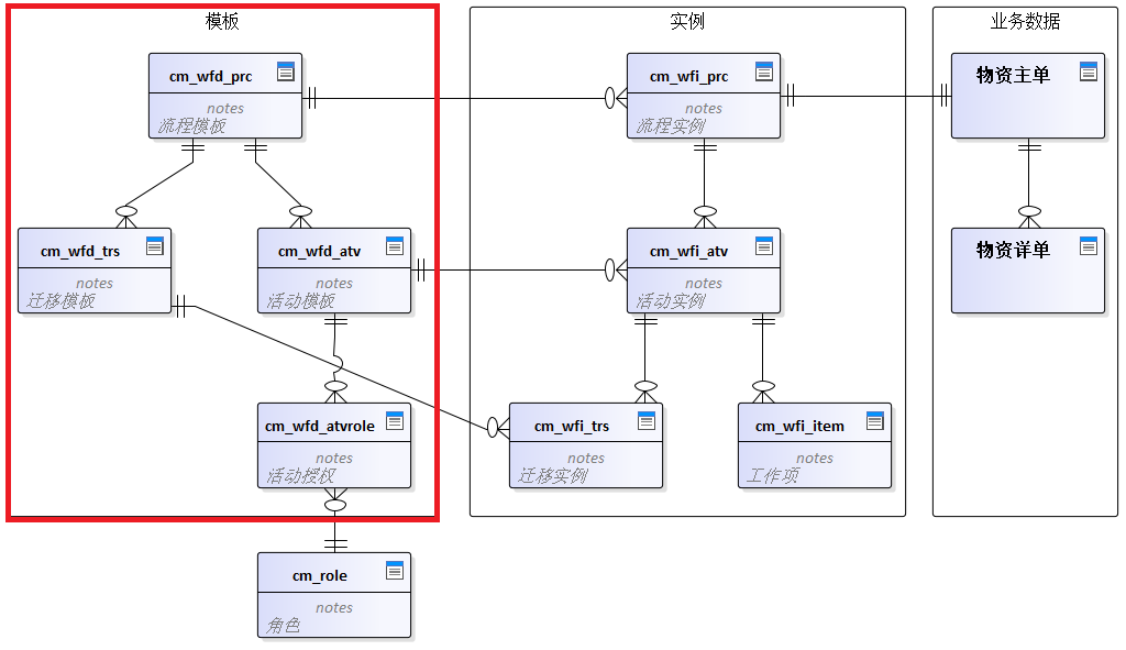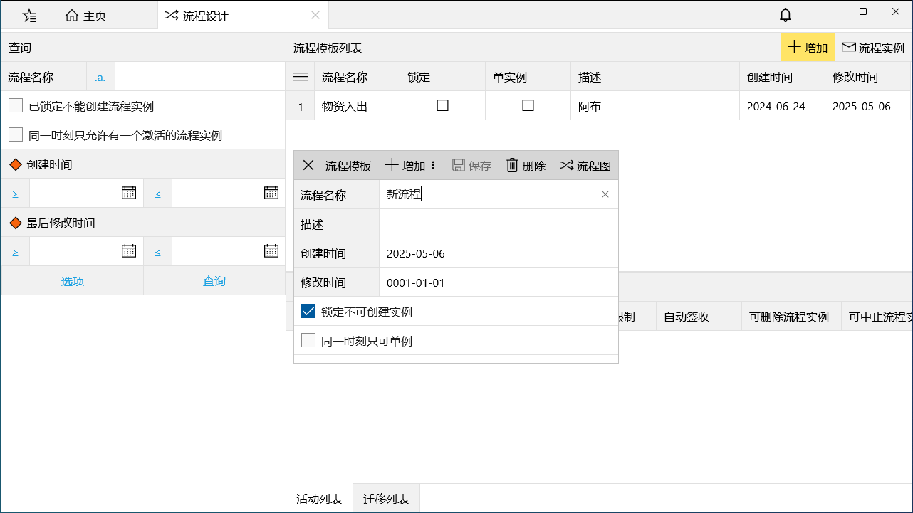 流程设计 约 201 字 预计阅读 1 分钟 数据结构红框区域的模板部分在流程设计中用到。创建流程模板打开主页菜单 -> 工作台 -> 流程设计,点击“增加”流程模板。增加流程模板流程名称不可重复,点击“流程图”或双击流程后进入流程模板设计界面。流程模板设计流程模板是最基础的工作流模型元素,它包含了解释、执行一个流程的全部模型信息。包括:流程的开始、结束条件;组成流程的活动;在活动间迁移的规则;调用的角色、实体模型;以及相关数据、逻辑的定义等。流程模板设计
